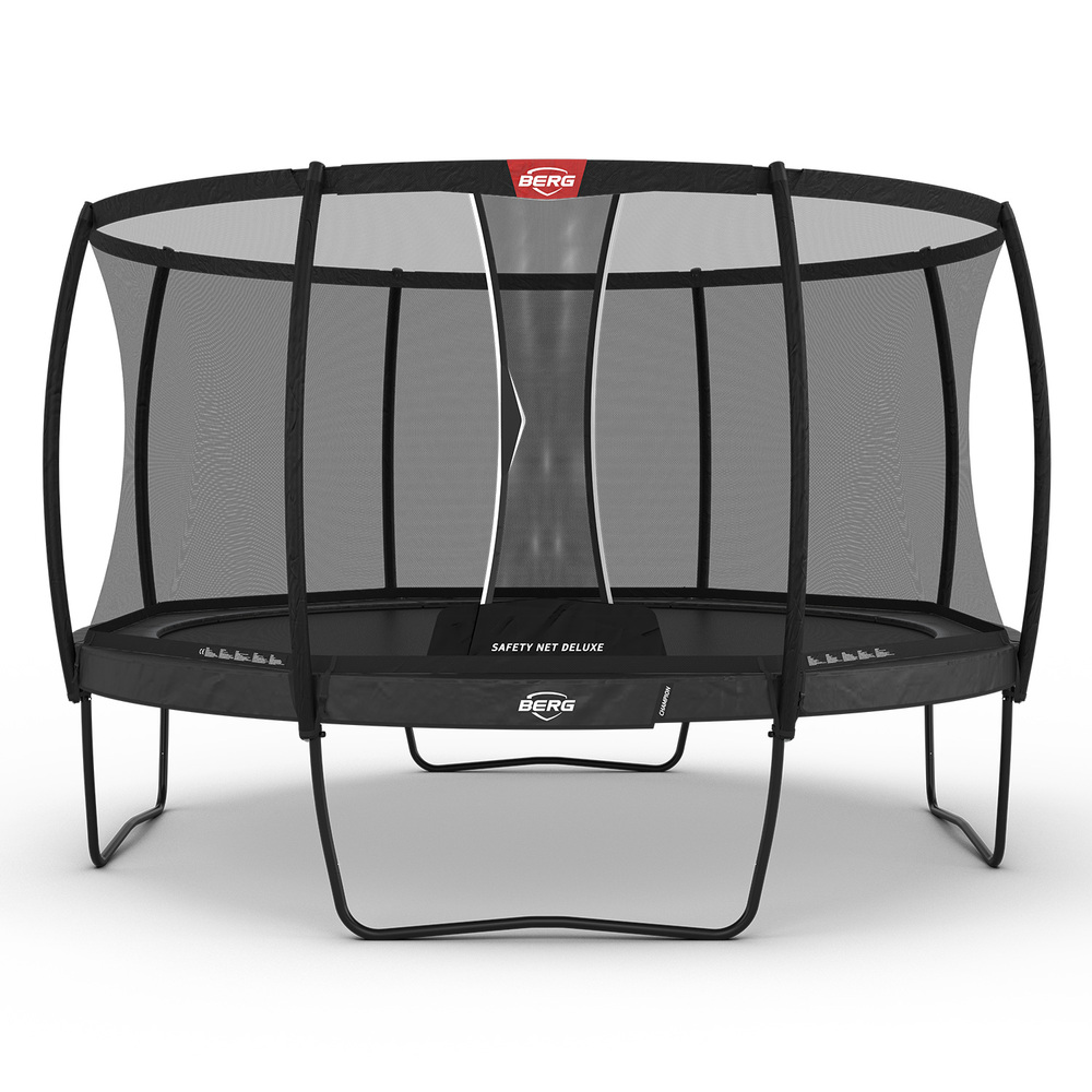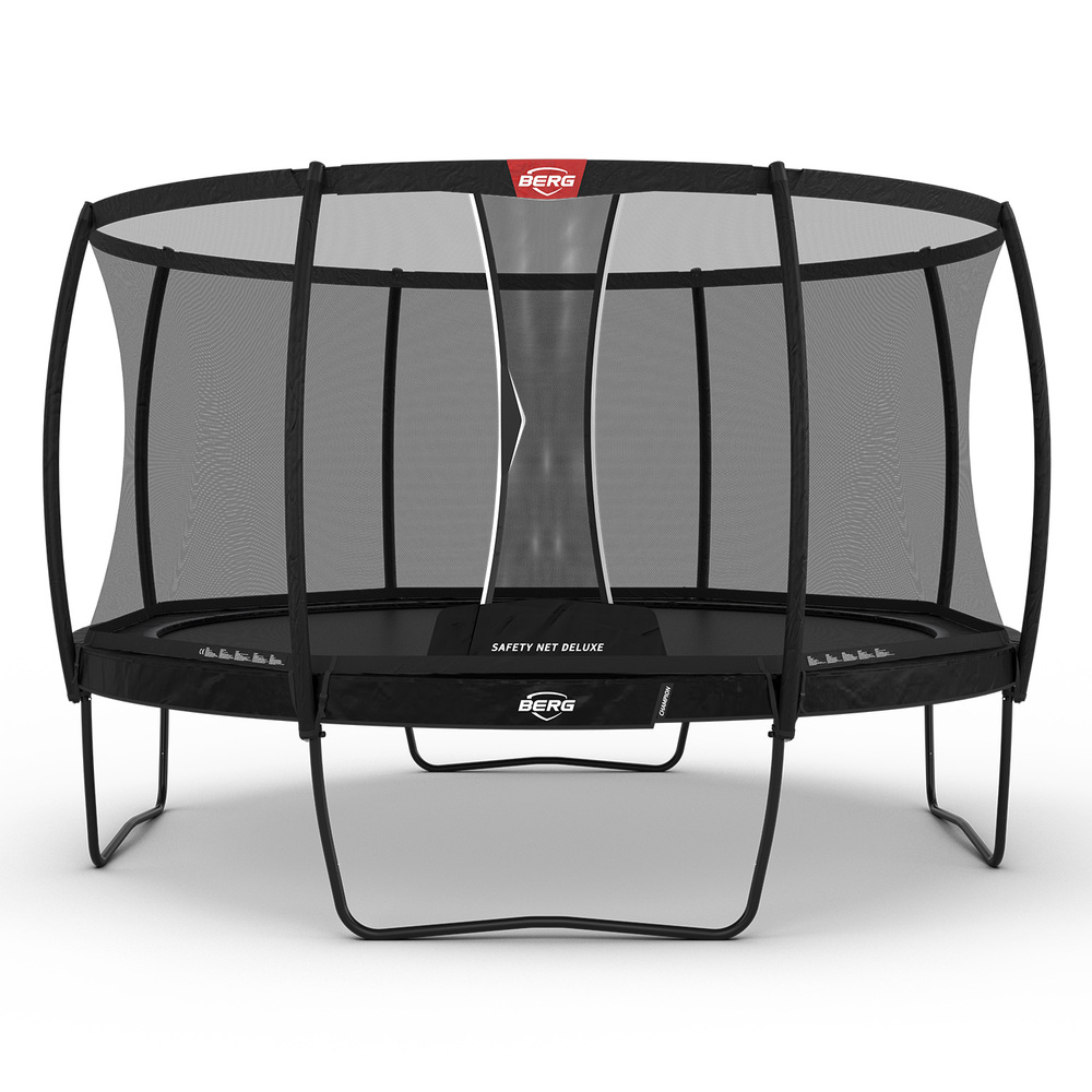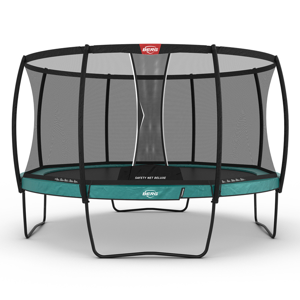 De BERG Champion 430 + DeluxeNet 430 is een trampoline met de beste combinatie van kwaliteit en prijs. Het is een weerbestendig en duurzame trampoline die blijven het hele jaar buiten. De BERG Champion voldoet aan de zware eisen van veiligheid van BERG. Naast het feit dat extra breed, het randkussen van de BERG Champion 430 + DeluxeNet 430 is ook extra dik. Dit geeft een grotere bescherming. De veren zijn bevestigd aan het springdoek door driehoekige haken en bevestigd door een 8 rijenstiksel. Het frame is aan de binnenzijde verzinkt en uit te maken roestvij. De TwinSpring Gold is een unieke veer van BERG waarmee de springenergie gelijdelijk wordt opgebouwd. Met deze veer zijn de krachten op het lichaam beduidend lager. Dit maakt de sprong hoger, veiliger en comfortabeler.