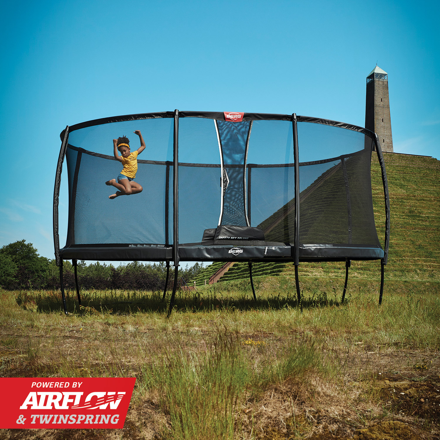 Maak de mooiste sprongen op de BERG Grand Champion 470 + DeluxeNet! Door het AirFlow springdoek en de TwinSpring veren kan je namelijk heerlijk onbezorgd springen. Door de ovale vorm van de BERG Grand Champion 470 + DeluxeNet kan je heerlijk springen over de hele lengte en is het frame net zo stevig als een rond frame.
