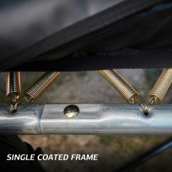 - • De constructie van de trampoline en van het net is door de constructie en door de stalen klemmen en montagestukken zeer stevig.