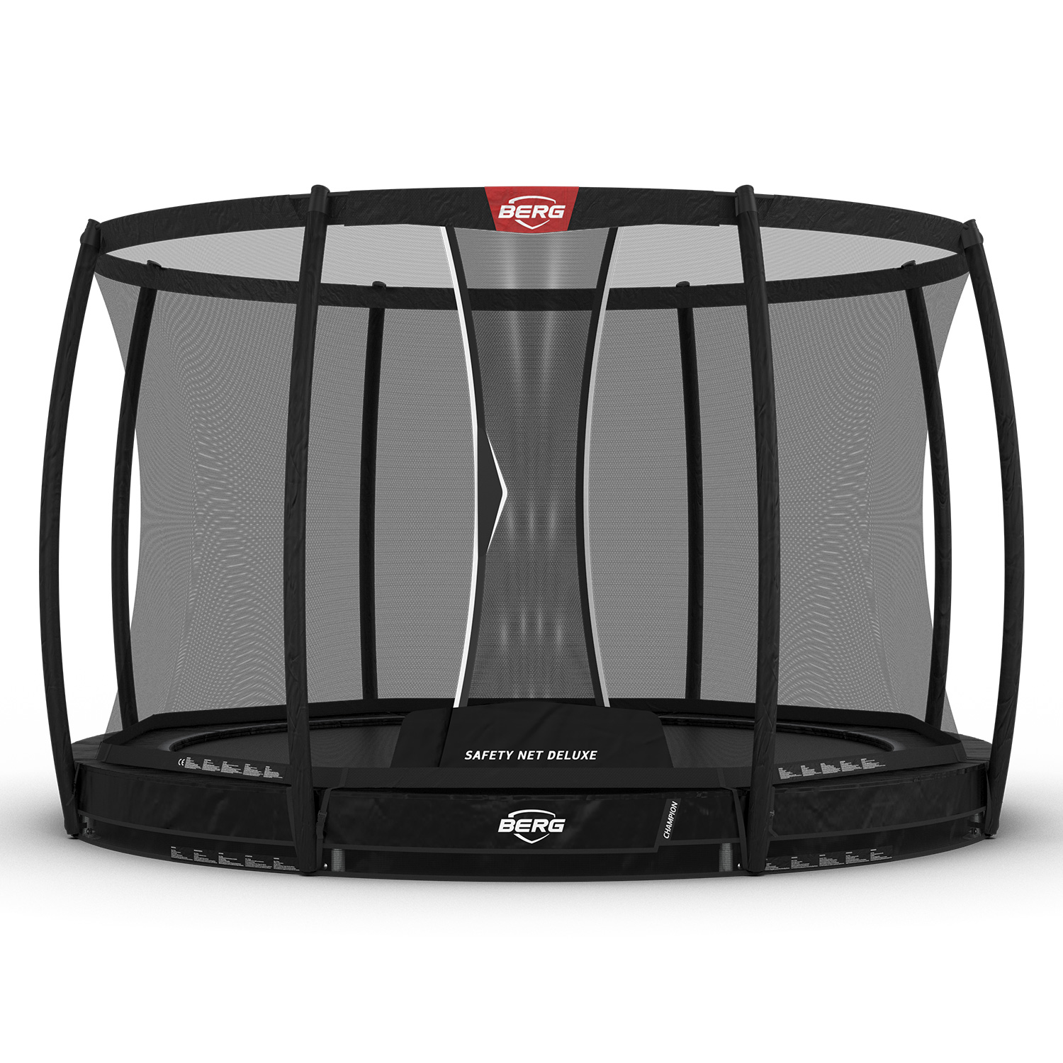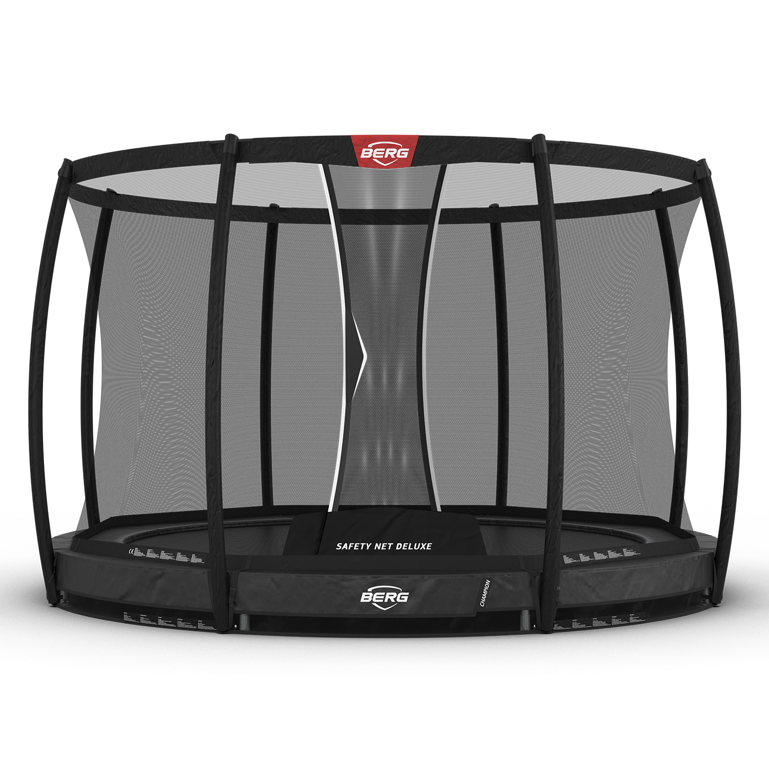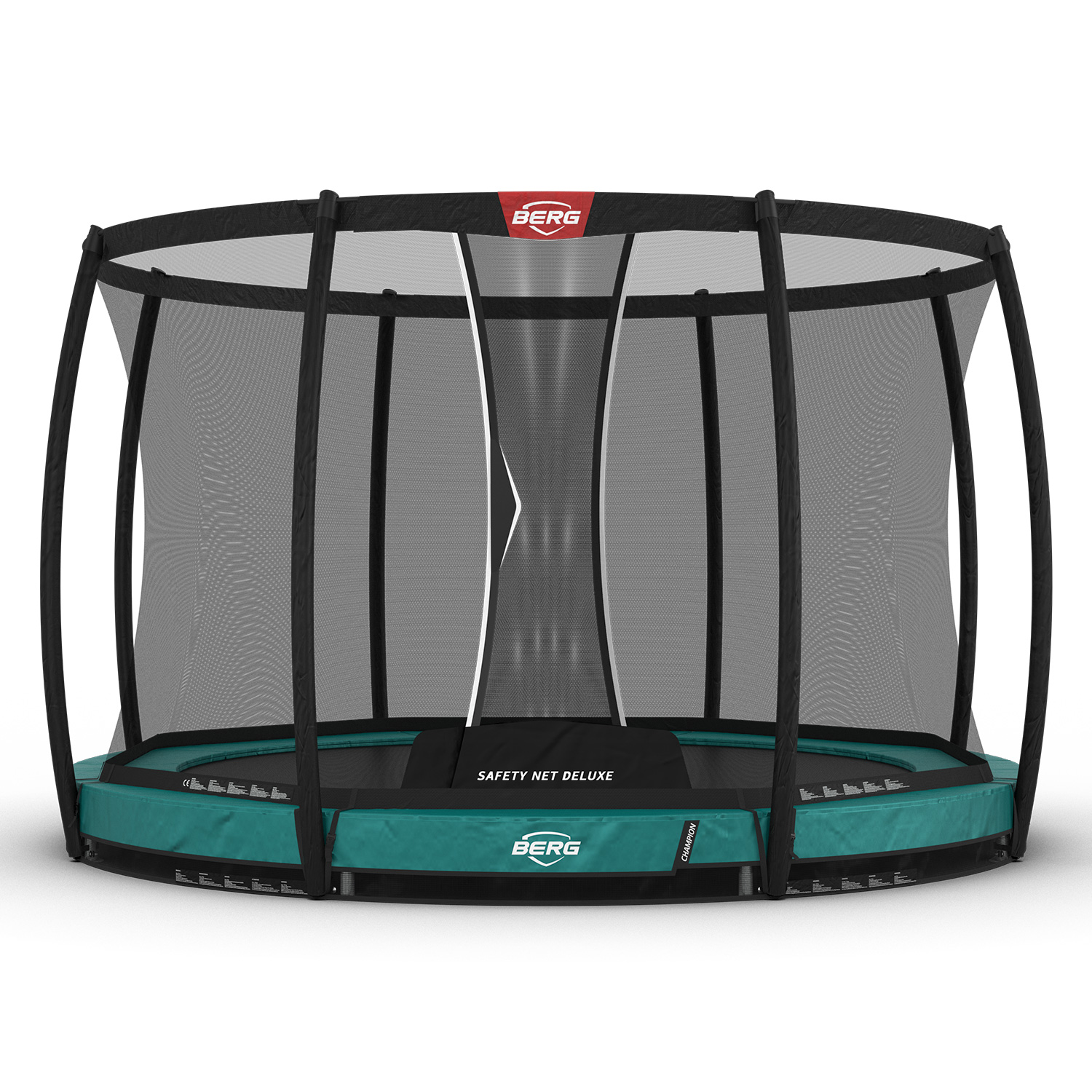 De BERG Inground Champion 330 + DeluxeNet 330 is een trampoline met de beste combinatie van kwaliteit en prijs. Het is een weerbestendig en duurzame trampoline die blijven het hele jaar buiten. De BERG Champion voldoet aan de zware eisen van veiligheid van BERG. Naast het feit dat extra breed, het randkussen van de BERG Inground Champion 330 + DeluxeNet 330 is ook extra dik. Dit geeft een grotere bescherming. De veren zijn bevestigd aan het springdoek door driehoekige haken en bevestigd door een 8 rijenstiksel. Het frame is aan de binnenzijde verzinkt en uit te maken roestvij. De TwinSpring Gold is een unieke veer van BERG waarmee de springenergie gelijdelijk wordt opgebouwd. Met deze veer zijn de krachten op het lichaam beduidend lager. Dit maakt de sprong hoger, veiliger en comfortabeler.