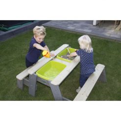 De EXIT Aksent Zand- Water- & tafel 2 zitbankjes is multifunctioneel. De zand-, water- en picknicktafel heeft twee groene bakken die gevuld kunnen worden met bijvoorbeeld water of zand, maar je kunt er ook speelgoed in opbergen. De groene bakken zijn uitneembaar en dus goed schoon te maken.