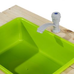 Het keukenblad heeft een fornuis met draaiknoppen en een wasbak met écht werkende kraan. De kraan functioneert wanneer je de tuinslang erop aansluit en dankzij de uitneembare wasbak is het kraanwater eenvoudig uit de wasbak te verwijderen. Onder het keukenblad zit een grote opbergruimte waar je al het speelgoed, zoals de pannen, kwijt kunt als de kinderen zijn uitgespeeld.