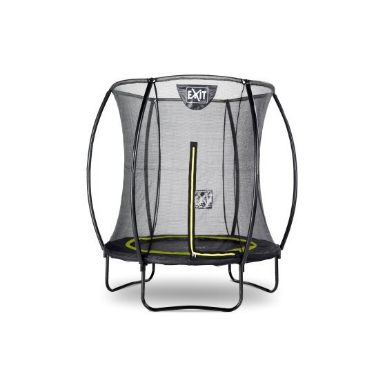 Deze EXIT Silhouette Ø 1m83 is uitgevoerd in een fraaie mat-‐zwarte kleur met frisse groene kleuraccenten. Dit geeft de trampoline een eigentijdse en elegante uitstraling. Bovendien heeft het veiligheidsnet fraaie gebogen staanders en hangt het net er strakgespannen in. Dit zorgt voor een mooie transparante uitstraling en is bovendien extra veilig omdat kinderen niet in het net kunnen blijven hangen. De staanders zijn uitgevoerd met een fraai omhulsel van hoogwaardig gecoat veiligheidsschuim zodat de kans op een botsing met pijnlijke afloop tot een minimum is gereduceerd. De beschermrand heeft een dikte van 20 millimeter over de volledige breedte van 28,5 cm en dekt de veren effectief af. Bovendien wordt de ruimte tussen de afdekrand en de veren veilig afgesloten door een net, zodat de kinderen niet met hun voeten bij de veren kunnen komen. De toegang tot de trampoline wordt afgeschermd door een stevige rits met contrasterende groene kleur zodat een onverwachte buiteling niet wordt afgesloten met een harde landing buiten het springoppervlak!