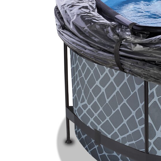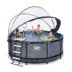 Het EXIT Stone zwembad ø360x122cm met zandfilter en overkapping + warmtepomp is een rond frame zwembad. Het zwembad is standaard voorzien van een zandfilterpomp en een zwembadtrap, waarmee je veilig het zwembad in en uit kunt stappen. Het frame zwembad biedt genoeg ruimte om heerlijk op een luchtbed te dobberen.