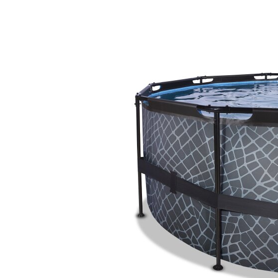 Ontdek hoe stevig een rond opzetzwembad kan zijn: het gepoedercoate stalen frame en de sterke poten van het EXIT Stone zwembad zorgen ervoor dat het bad altijd stabiel staat en jarenlang meegaat. De meegeleverde filterpomp houdt het water schoon en in beweging zodat vervuiling van het water wordt tegengegaan. De filterpomp kan eenvoudig aan het zwembad worden gemonteerd en door middel van filtercartridges wordt het water ververst. In het EXIT Stone zwembad neem je altijd een frisse duik!