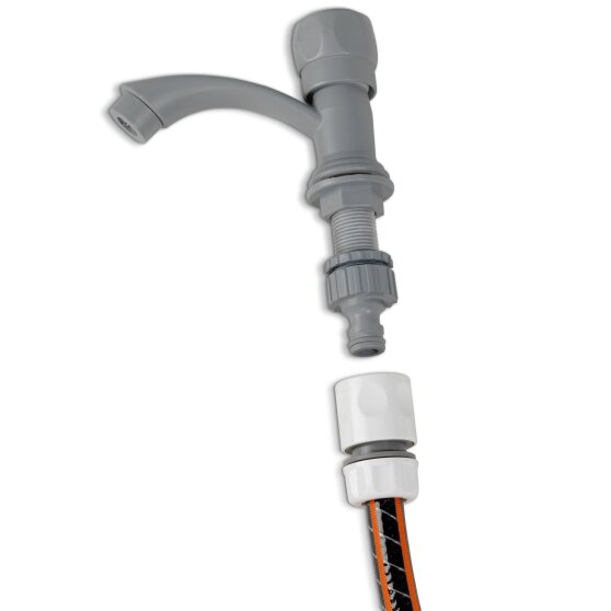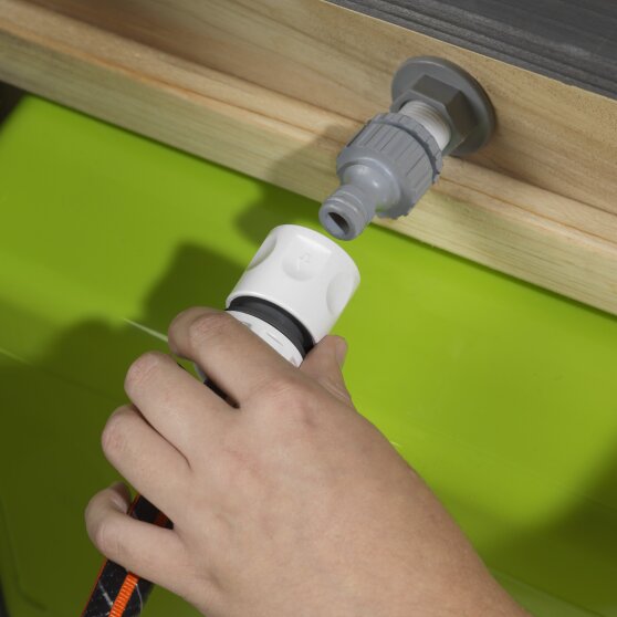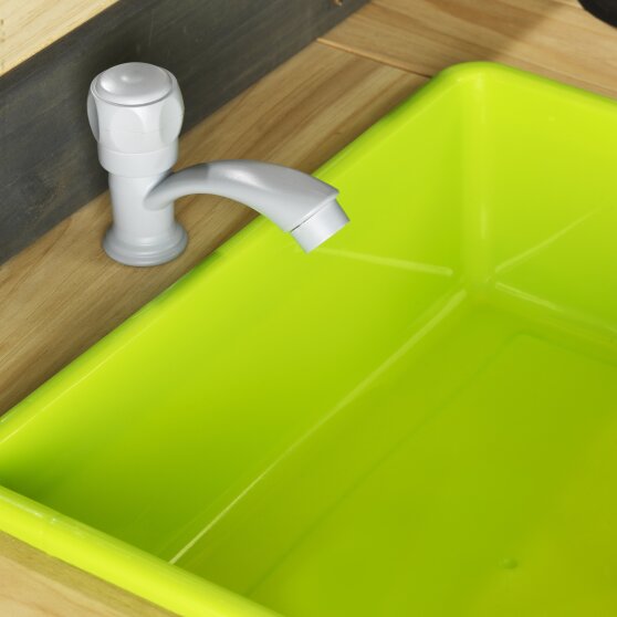 Met de EXIT Yummy 200 waan je jezelf in een echte keuken. De buitenkeuken heeft een fornuis en oven met draaiknoppen en een écht werkende kraan. De kraan functioneert wanneer je de tuinslang erop aansluit en dankzij de uitneembare wasbak is het kraanwater weer eenvoudig uit de wasbak te verwijderen. Net als in een echte keuken kun je handen wassen, glazen vullen en afwassen! Daarnaast heeft de EXIT Yummy 200 voldoende opbergruimte voor pannen en andere keukenaccessoires en het overige keukengerei hang je op aan de haakjes. Bij de EXIT Yummy buitenkeukens is voor de perfecte kookbeleving aan alles gedacht!