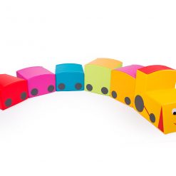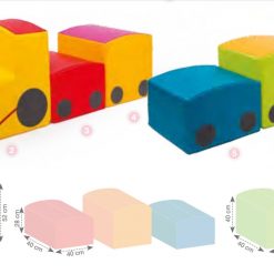 Verder in de softplay set zit ook de Funny trein: 6 elementen (40x40cm, h 28/40) vormen een kleurrijk geheel waar de kinderen op en over kunnen klauteren. Onder deze trein zijn veiligheidsmatten voorzien zodat valpartijen steeds zacht eindigen. Totale lengte: 2.6m